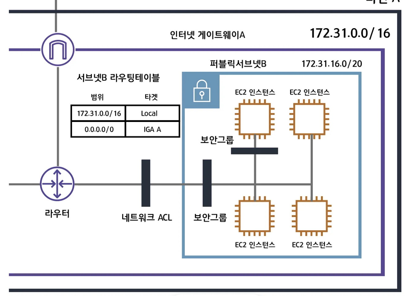 - 서브넷 a의 라우팅 테이블은 로컬안에서 찾도록 되어 있다 172.31.0.0/16 은 서브넷에 포함되는 ip주소니까!