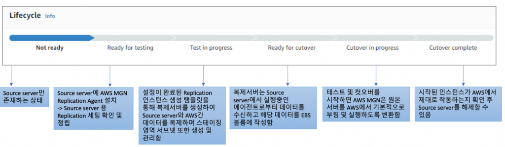 - 테스트 및 컷오버 단계가 시작되면 원본 서버를 aws에서 기본적으로 부팅 및 실행하도록 변환
