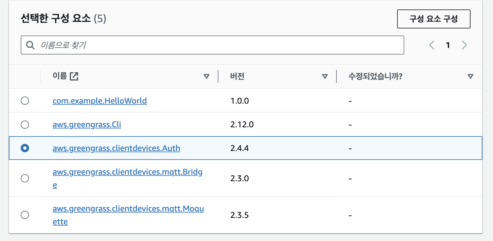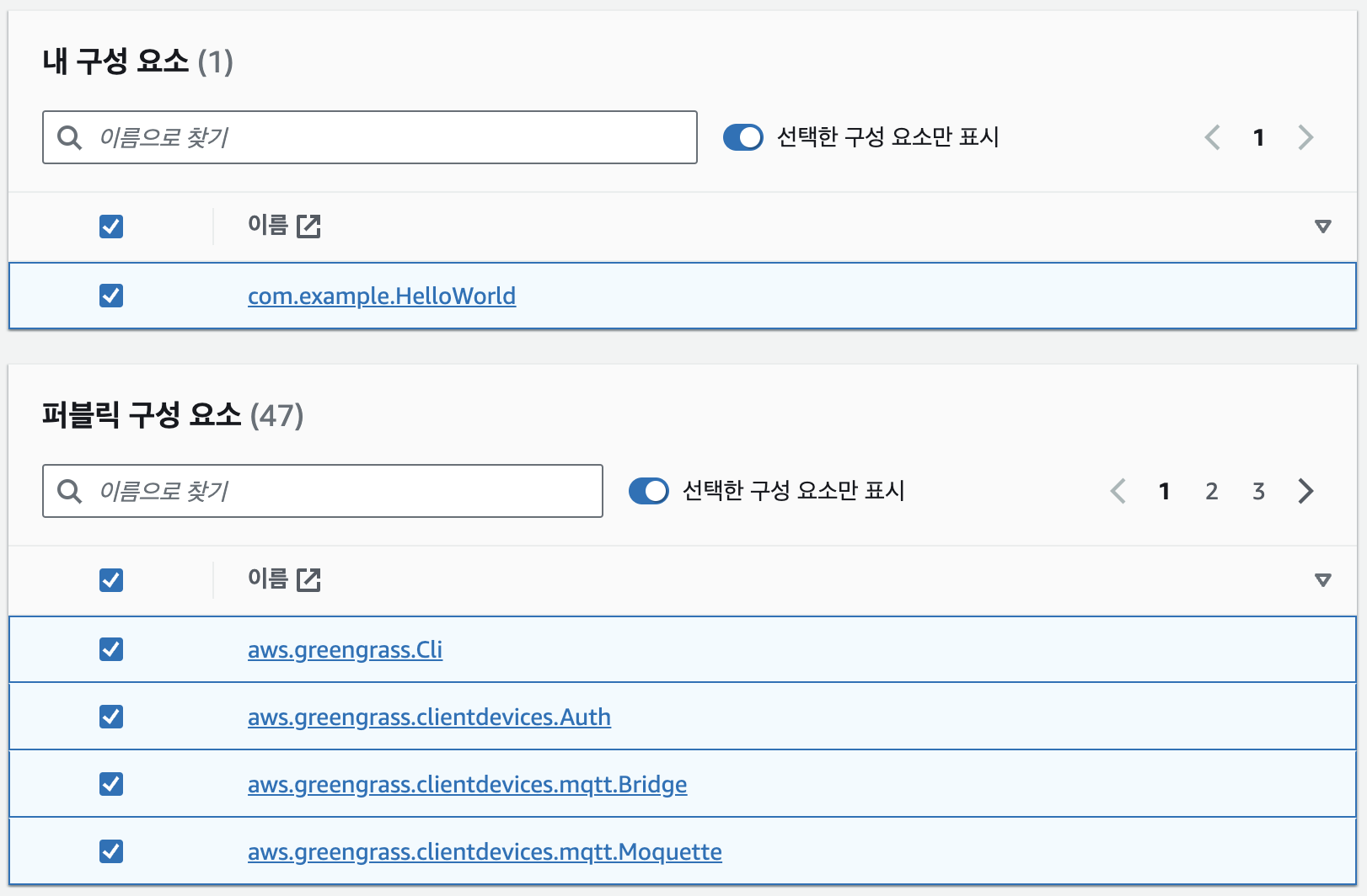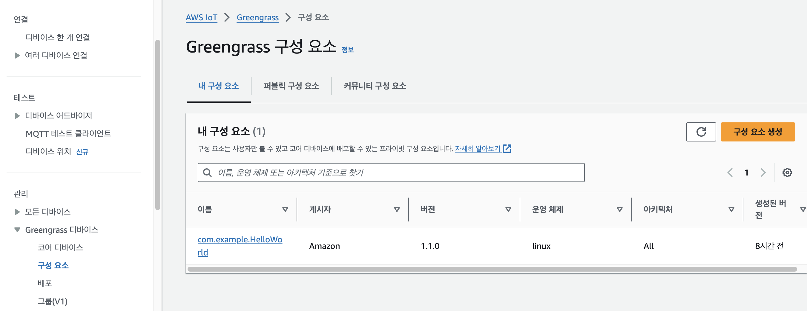 cd /home/ubuntu/environment/GreengrassCore/recipes && aws greengrassv2 create-component-version --inline-recipe fileb://cohttp://m.example.HelloWorld-1.0.0.json --region $AWS_DEFAULT_REGION # component 목록 확인 aws greengrassv2 list-components --region $AWS_DEFAULT_REGION