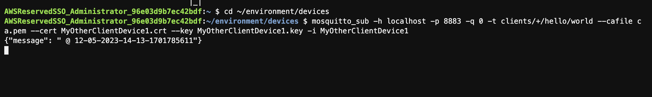 # Auth { "deviceGroups": { "formatVersion": "2021-03-05", "definitions": { "MyDeviceGroup": { "selectionRule": "thingName: MyClientDevice* OR thingName: MyOtherClientDevice*", "policyName": "MyClientDevicePolicy" } }, "policies": { "MyClientDevicePolicy": { "AllowAll": { "statementDescription": "Allow client devices.", "operations": [ "mqtt:connect", "mqtt:publish", "mqtt:subscribe" ], "resources": [ "*" ] } } } } } # Bridge { "mqttTopicMapping": { "HelloWorldIotCoreMapping": { "topic": "clients/+/hello/world", "source": "LocalMqtt", "target": "IotCore" } } }- Mosquitto 클라이언트를 사용해 장치를 시뮬레이션