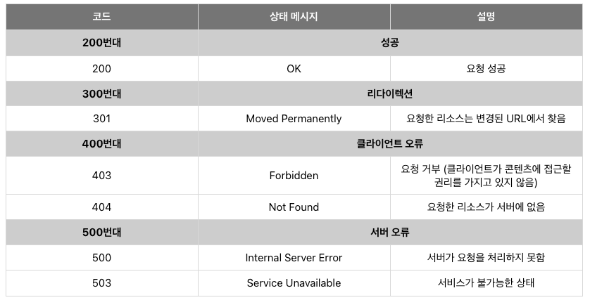 코드 상태 메시지 설명 200번대 성공 200 OK 요청 성공 300번대 리다이렉션 301 Moved Permanently 요청한 리소스는 변경된 URL에서 찾음 400번대 클라이언트 오류 403 Forbidden 요청 거부 (클라이언트가 콘텐