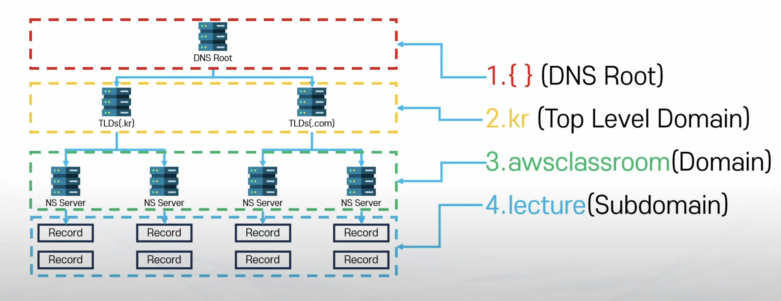 - 최상위 도메인부터 차례대로 계층구조로 구성