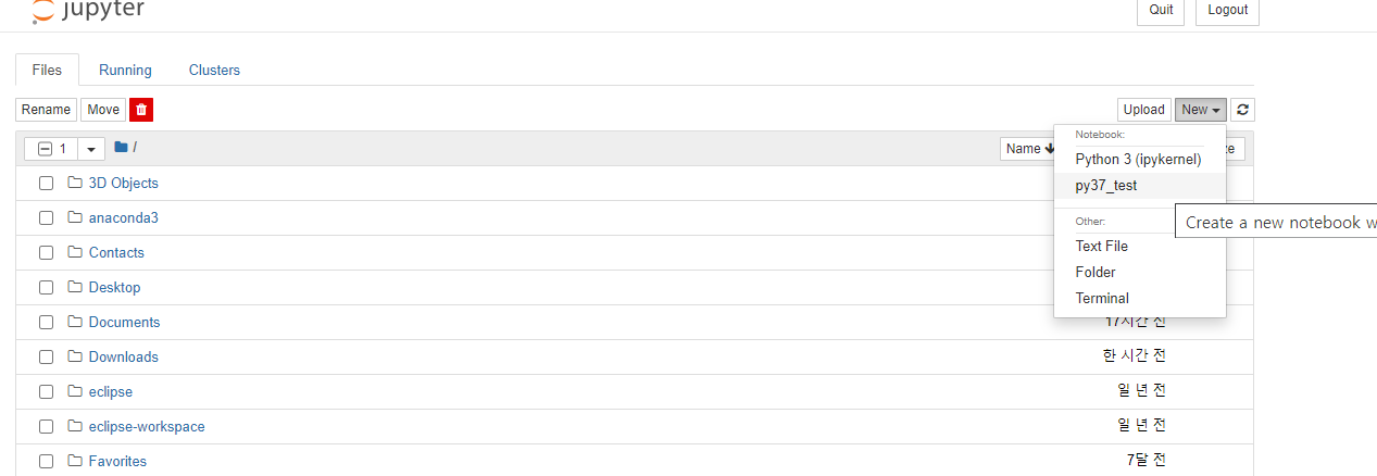 jupyter notebook그럼 가상환경에서 돌아가는 주피터 노트북이 실행된다.